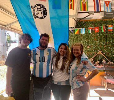 Tuvimos la suerte de contar con la presencia de Pepe Rocha y Sonia Carujo que nos cantaron y nos tocaron la guitarra. Además, los primos y amigos se unieron para servir el asado, preparar las ensaladas, y pintar un mural de aerosol improvisado en el galpón que decía "Argentina Campeón 2022," con tres estrellas.